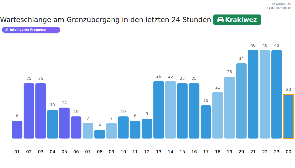 Die prognostizierte Wartezeit am Grenzübergang Krakiwez beträgt 47-215 Minuten. Meiden Sie die Stoßzeiten: 17:00, 18:00, 20:00. Die besten Übertrittszeiten sind 23:00, 04:00, 22:00.