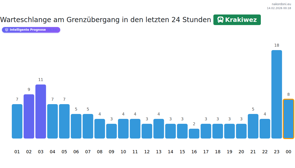 Die prognostizierte Wartezeit für Busse am Grenzübergang Krakiwez liegt zwischen 150 und 555 Minuten. Um lange Warteschlangen zu vermeiden, sollten Sie Überquerungen um 01:00, 02:00 und 20:00 Uhr meiden. Die besten Zeiten sind 05:00, 09:00 und 15:00 Uhr.