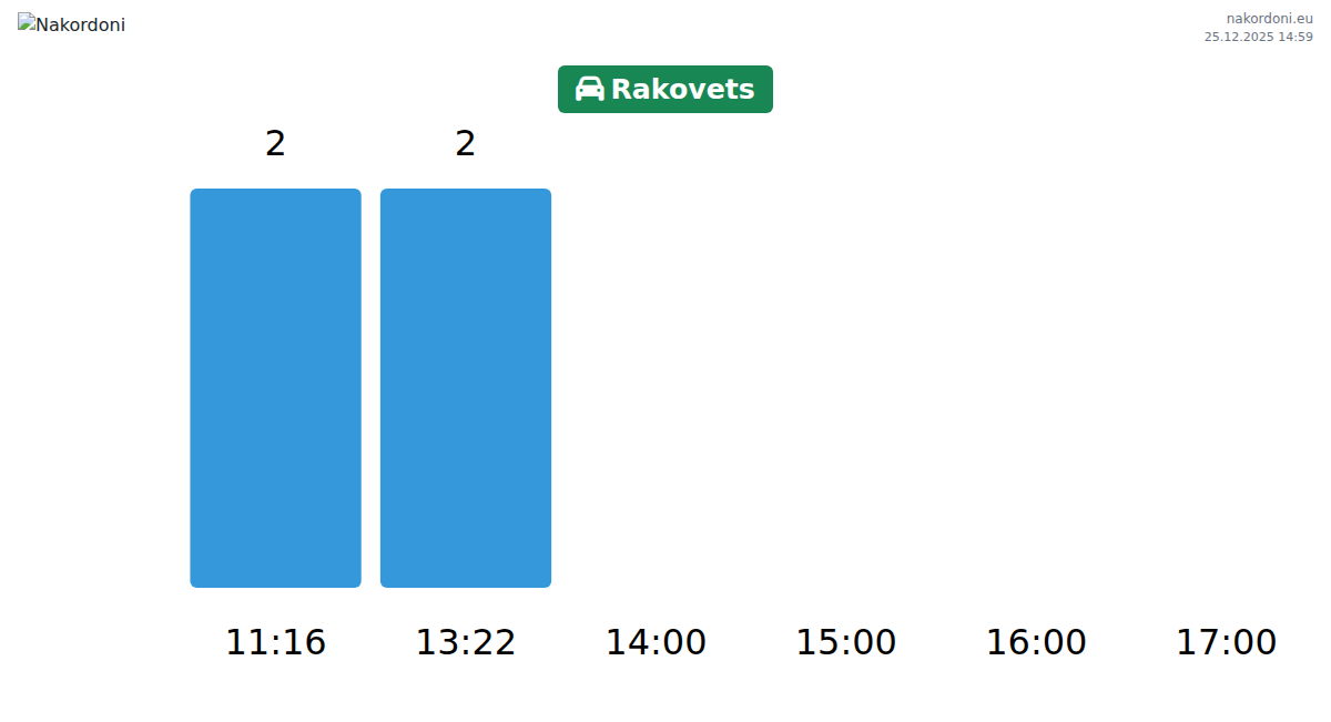 In Rakowez beträgt die Wartezeit für Pkw voraussichtlich 15-51 Minuten. Meiden Sie Stoßzeiten wie 18:00, 19:00 und 13:00 Uhr. Kürzere Wartezeiten gibt es meist zwischen 23:00 und 01:00 Uhr.