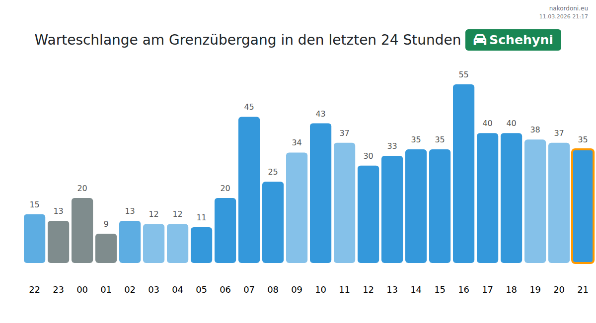 Planen Sie Ihre Reisen im Voraus und nutzen Sie aktuelle Informationen über die Warteschlangen an der Grenze am Grenzübergang Schehyni - Personenkraftwagen, um Ihren Grenzübertritt schnell und bequem zu gestalten. Achten Sie besonders auf diese Stunden, um Stoßzeiten zu vermeiden und die Wartezeiten zu verkürzen.