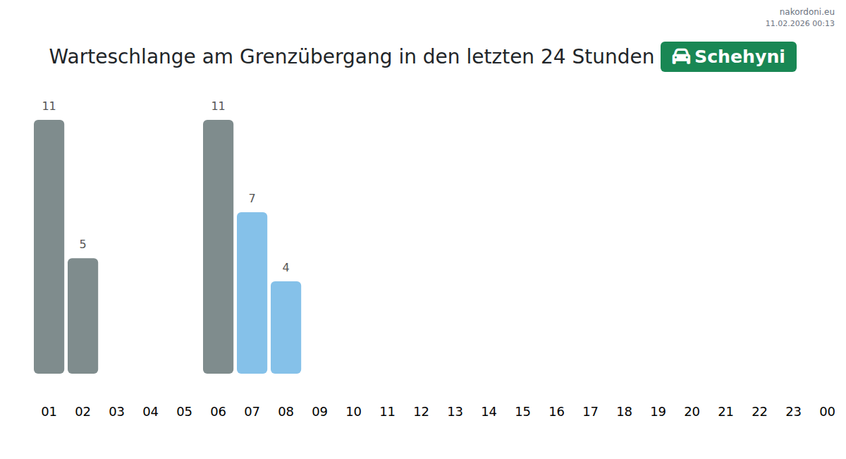 Am Grenzübergang Schehyni beträgt die Wartezeit 15–207 Min. Vermeiden Sie die Stoßzeiten um 10:00, 17:00 und 13:00 Uhr. Die beste Zeit für die Überreise ist um 01:00, 02:00 oder 05:00 Uhr.
