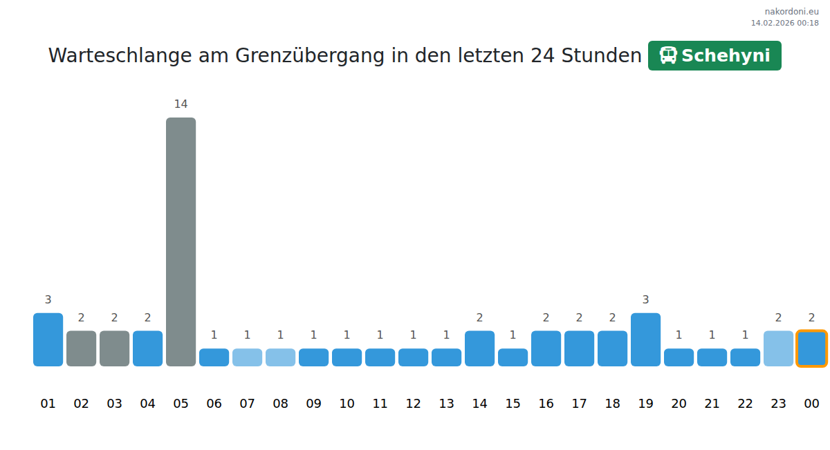 Am Grenzübergang Schehyni wird die Wartezeit für Busse voraussichtlich zwischen 95 und 815 Minuten liegen. Vermeiden Sie Stoßzeiten wie 19:00, 21:00 und 03:00. Die besten Überfahrtszeiten sind 23:00, 02:00 und 04:00, wenn die Warteschlangen am kürzesten sind.