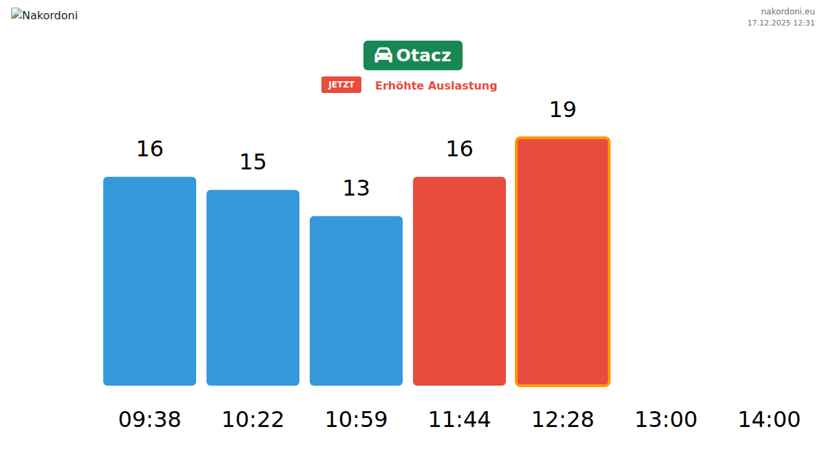 Am Grenzübergang Otatschi ist für Pkw mit Wartezeiten von 39-135 Minuten zu rechnen. Meiden Sie Stoßzeiten um 13:00, 09:00 und 07:00 Uhr. Die besten Überfahrtszeiten sind 23:00, 00:00 und 01:00 Uhr.