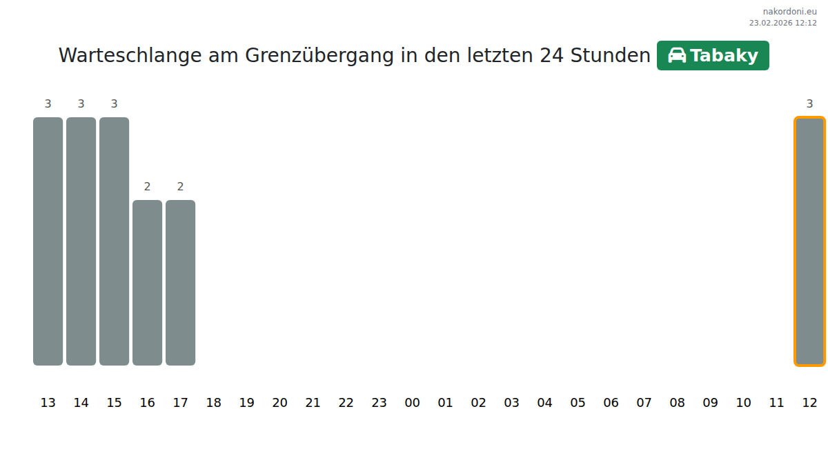 Am Grenzübergang Tabaky beträgt die Wartezeit für PKW 15-45 Minuten. Meiden Sie die Stoßzeiten um 07:00, 08:00 und 16:00 Uhr. Die besten Zeiten für eine schnelle Überfahrt sind 20:00, 21:00 und 23:00 Uhr.
