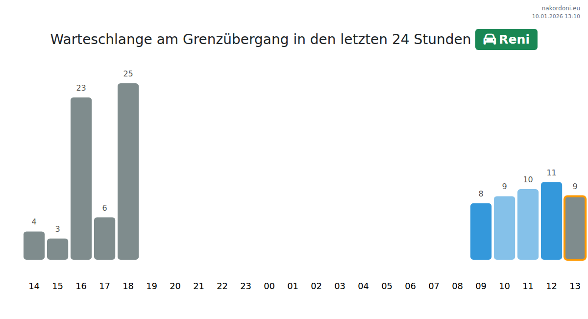 Am Grenzübergang Reni beträgt die Wartezeit voraussichtlich 15 bis 20185 Minuten. Meiden Sie Stoßzeiten um 08:00, 23:00 und 01:00 Uhr. Die kürzesten Warteschlangen sind typischerweise um 02:00, 06:00 und 13:00 Uhr.