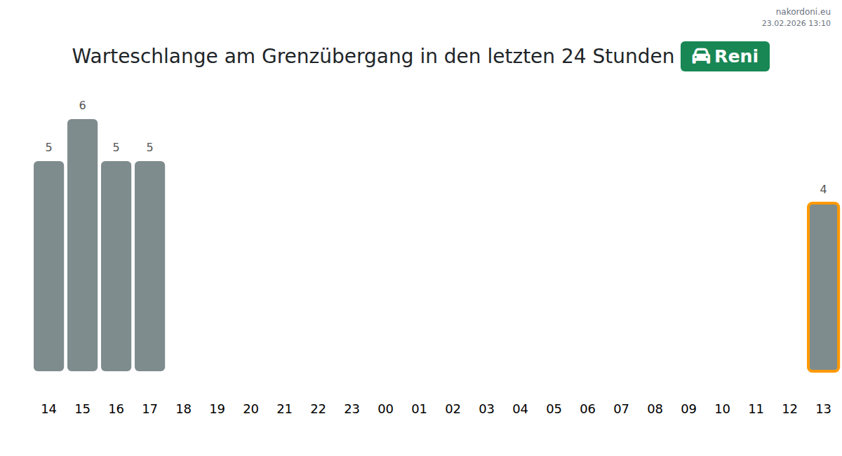 Am Grenzübergang Reni beträgt die Wartezeit für Pkw 15 bis 12745 Minuten. Meiden Sie die Zeiten 00:00, 01:00 und 06:00. Die besten Überfahrtszeiten sind 02:00, 16:00 und 10:00.