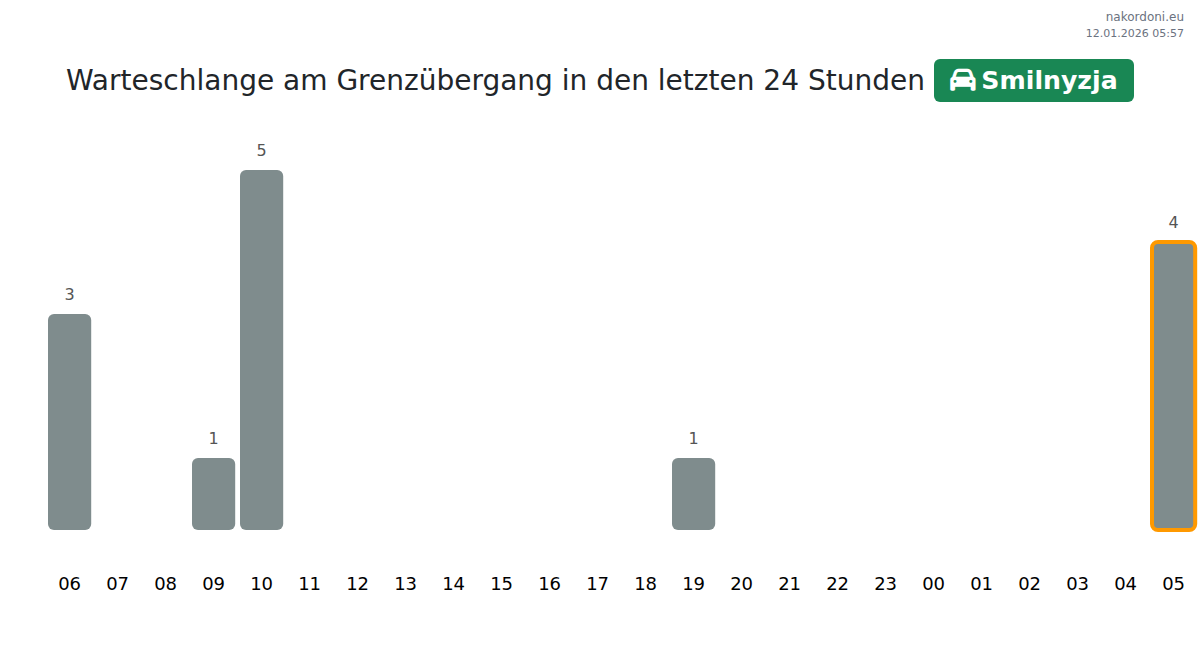 In Smilnyzja beträgt die Wartezeit für PKWs 15-429 Minuten. Vermeiden Sie Stoßzeiten um 10:00, 11:00, 17:00. Die kürzesten Warteschlangen werden gegen 22:00, 00:00, 05:00 erwartet.