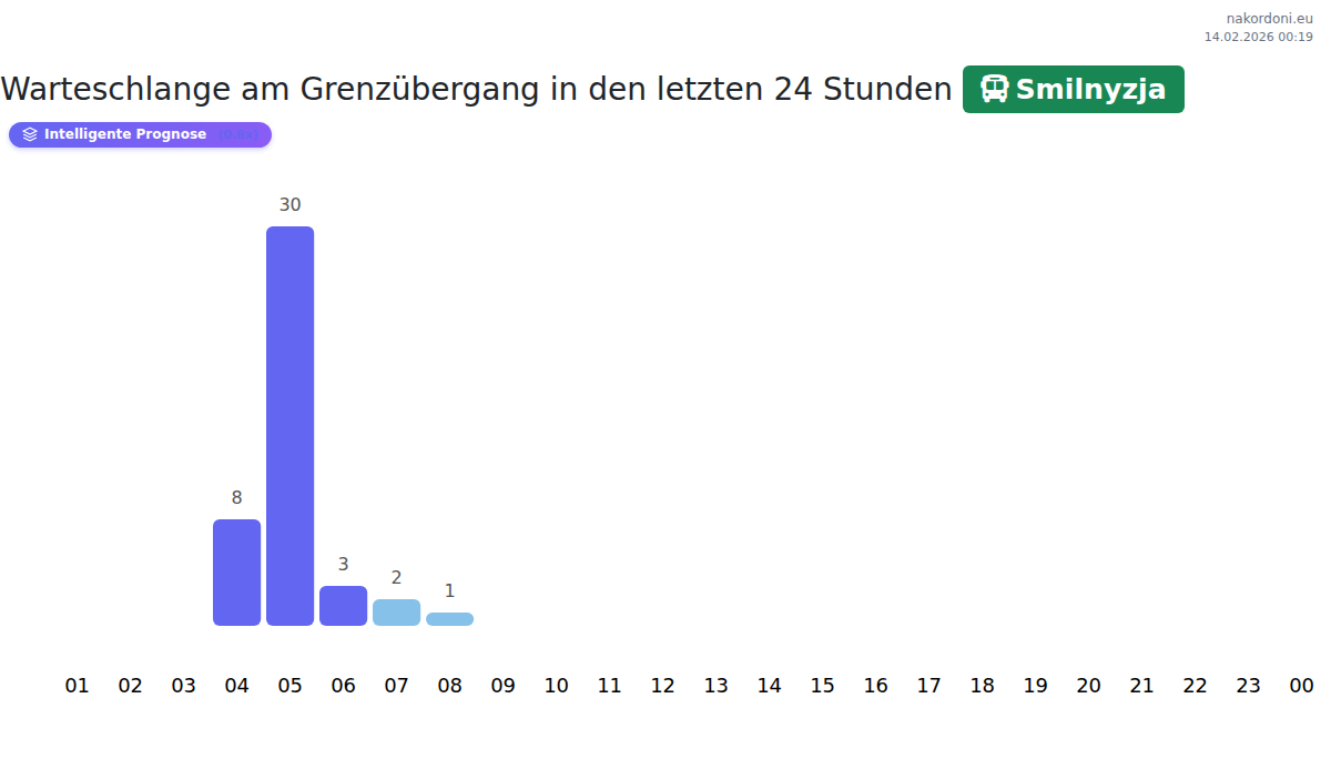 An der Smilnyzja beträgt die Wartezeit 15 bis 2895 Minuten. Vermeiden Sie Grenzübertritte um 02:00, 03:00 und 08:00 Uhr wegen Spitzenzeiten. Die besten Zeiten sind 23:00, 00:00 oder 01:00 Uhr für kürzere Wartezeiten.