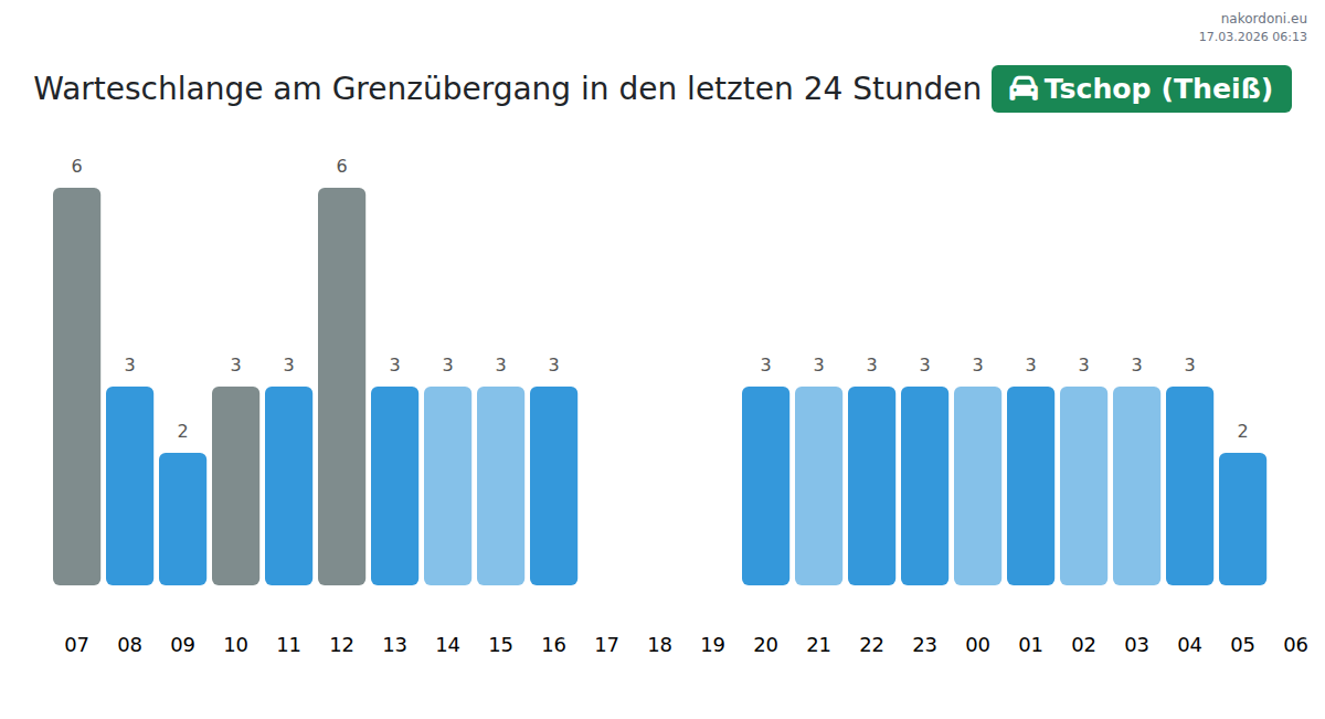 Planen Sie Ihre Reisen im Voraus und nutzen Sie aktuelle Informationen über die Warteschlangen an der Grenze am Grenzübergang Tschop (Theiß) - Personenkraftwagen, um Ihren Grenzübertritt schnell und bequem zu gestalten. Achten Sie besonders auf diese Stunden, um Stoßzeiten zu vermeiden und die Wartezeiten zu verkürzen.