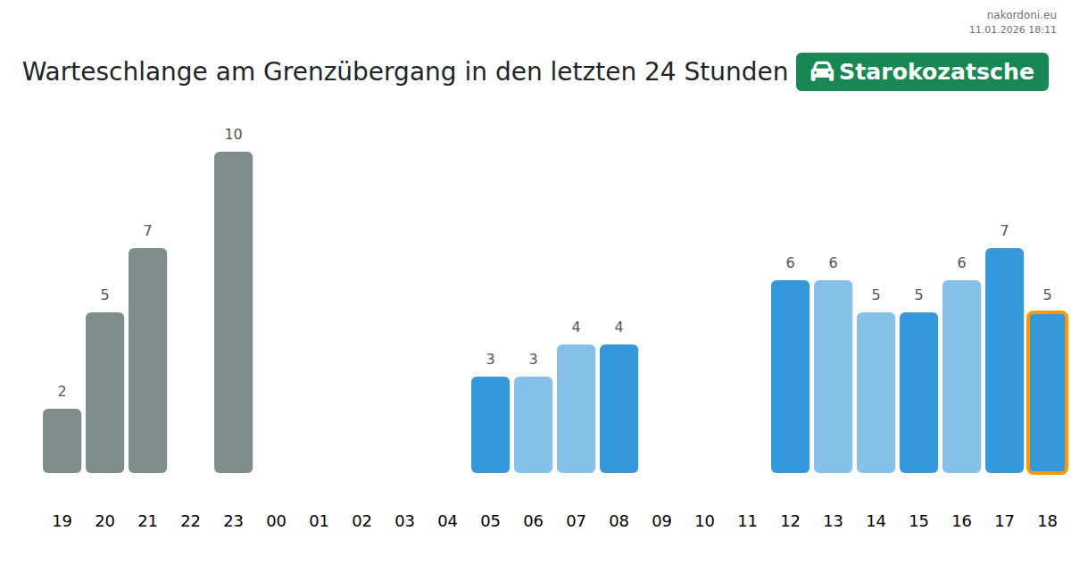 Planen Sie Ihre Reisen im Voraus und nutzen Sie aktuelle Informationen über die Warteschlangen an der Grenze am Grenzübergang Starokozatsche - Personenkraftwagen, um Ihren Grenzübertritt schnell und bequem zu gestalten. Achten Sie besonders auf diese Stunden, um Stoßzeiten zu vermeiden und die Wartezeiten zu verkürzen.
