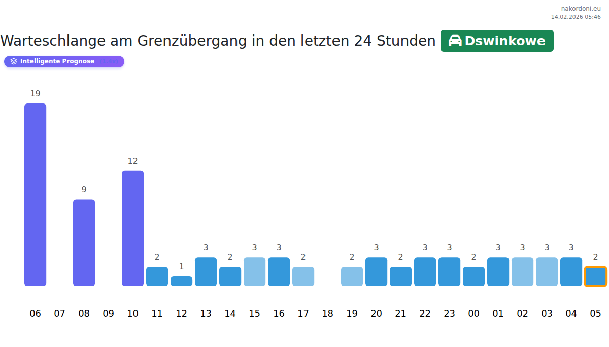 Am Grenzübergang Dswinkowe beträgt die Wartezeit für PKW zwischen 15 und 435 Minuten. Vermeiden Sie die Stoßzeiten um 01:00, 04:00 und 13:00 Uhr. Die besten Reisezeiten sind 00:00, 03:00 und 05:00 Uhr.