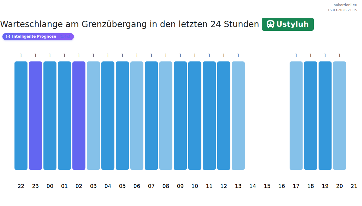 Am Ustyluh werden Buswartezeiten von 15-175 Minuten erwartet. Vermeiden Sie Stoßzeiten zwischen 20:00-22:00 Uhr. Für kürzere Wartezeiten empfehlen sich Übertritte gegen 05:00, 09:00 oder 15:00 Uhr.
