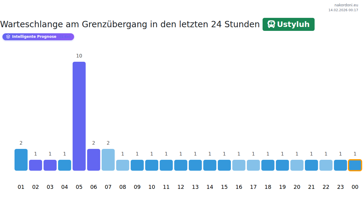 Am Kontrollpunkt Ustyluh können Busse Wartezeiten von 15-575 Minuten erwarten. Meiden Sie Stoßzeiten: 22:00, 04:00, 03:00. Die besten Überfahrtszeiten sind 18:00, 23:00, 00:00 für kürzere Warteschlangen.