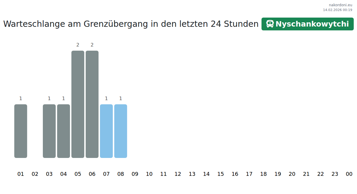 Um lange Warteschlangen an der Grenze am Grenzübergang Nyschankowytchi - Bus zu vermeiden, wird empfohlen, den Grenzübertritt während der Zeiten mit der geringsten Auslastung zu planen. Laut den Daten des letzten Tages wurde die geringste Anzahl von Fahrzeugen zwischen :00 und 9:00 Uhr beobachtet. Dies ist die ideale Zeit für den Grenzübertritt, um Zeit zu sparen und Verzögerungen zu vermeiden.