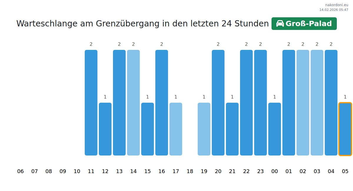 An der Grenzkontrollstelle Groß-Palad beträgt die Wartezeit 15-55 Minuten. Vermeiden Sie die Stoßzeiten um 17:00, 22:00 und 23:00 Uhr für eine schnellere Abwicklung. Die besten Reisezeiten sind 00:00, 01:00 und 02:00 Uhr.