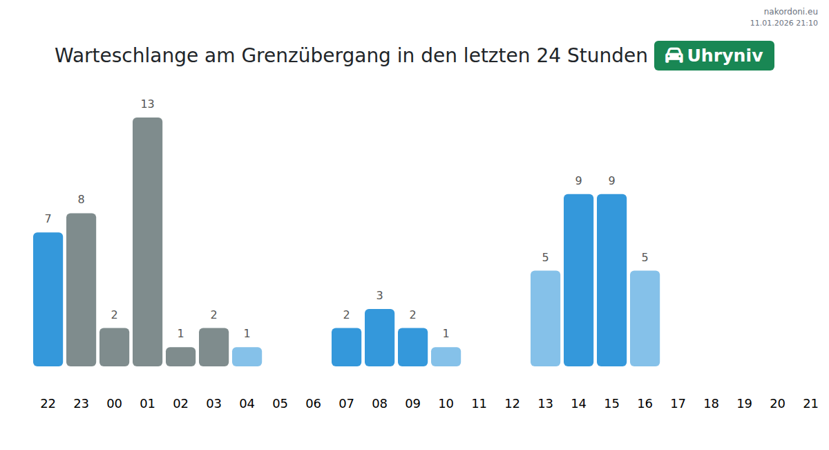 Am Uhryniv sind Wartezeiten für Autos 33-165 Min. Vermeiden Sie Stoßzeiten: 16:00, 17:00, 20:00. Beste Zeiten: 09:00, 22:00, 00:00.