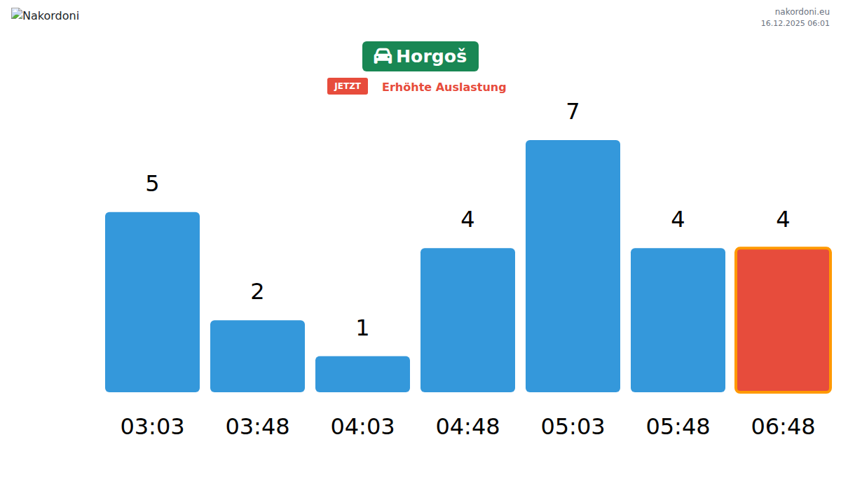 Planen Sie Ihre Reisen im Voraus und nutzen Sie aktuelle Informationen über die Warteschlangen an der Grenze am Grenzübergang Horgos - Personenkraftwagen, um Ihren Grenzübertritt schnell und bequem zu gestalten. Achten Sie besonders auf diese Stunden, um Stoßzeiten zu vermeiden und die Wartezeiten zu verkürzen.