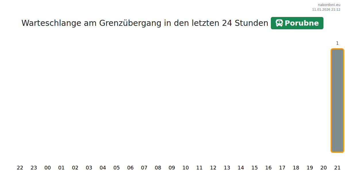 Am Grenzübergang Porubne beträgt die Wartezeit für Busse 15-255 Minuten. Meiden Sie die Stoßzeiten: 13:00, 19:00, 01:00. Die besten Übertrittszeiten sind 23:00, 00:00 oder 02:00.