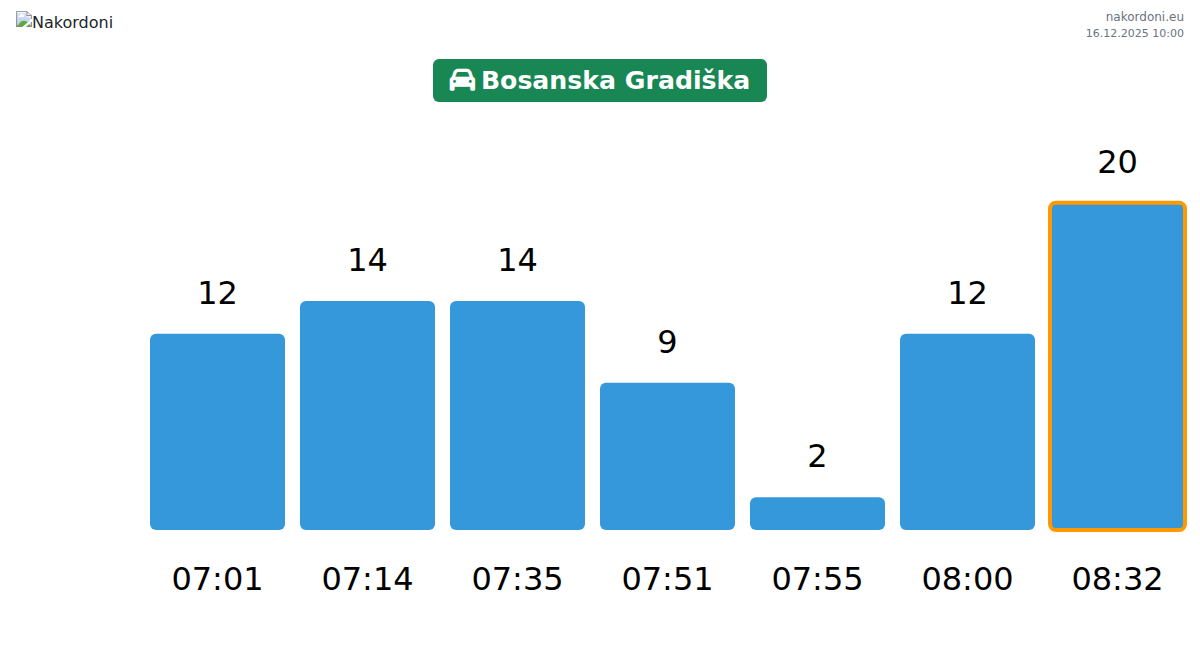Planen Sie Ihre Reisen im Voraus und nutzen Sie aktuelle Informationen über die Warteschlangen an der Grenze am Grenzübergang Bosnisch Gradischka - Personenkraftwagen, um Ihren Grenzübertritt schnell und bequem zu gestalten. Achten Sie besonders auf diese Stunden, um Stoßzeiten zu vermeiden und die Wartezeiten zu verkürzen.