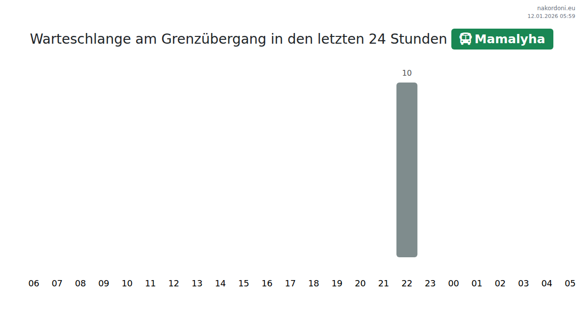 Am Grenzübergang Mamalyha beträgt die Wartezeit für Busse 15-15 Minuten. Um lange Wartezeiten zu vermeiden, empfehlen wir, die Stoßzeiten von 21:00 bis 23:00 Uhr zu meiden. Die beste Reisezeit ist zwischen 00:00 und 02:00 Uhr.
