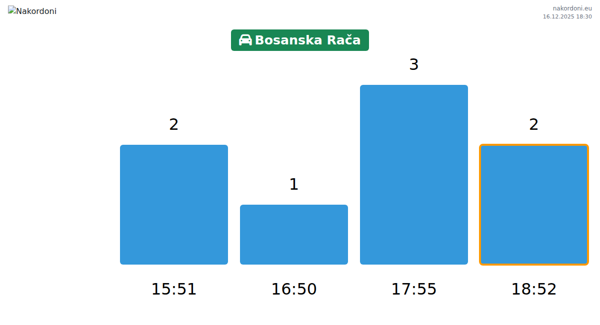 Planen Sie Ihre Reisen im Voraus und nutzen Sie aktuelle Informationen über die Warteschlangen an der Grenze am Grenzübergang Bosnisch Ratscha - Personenkraftwagen, um Ihren Grenzübertritt schnell und bequem zu gestalten. Achten Sie besonders auf diese Stunden, um Stoßzeiten zu vermeiden und die Wartezeiten zu verkürzen.