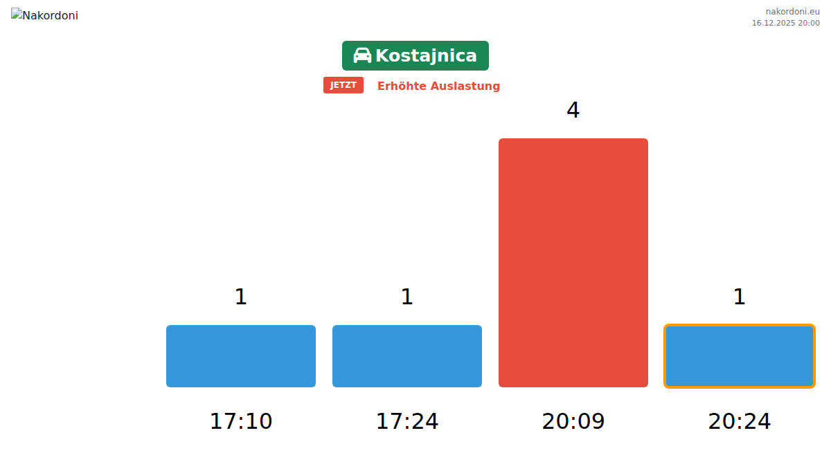 Um lange Warteschlangen an der Grenze am Grenzübergang Kostajnica - Personenkraftwagen zu vermeiden, wird empfohlen, den Grenzübertritt während der Zeiten mit der geringsten Auslastung zu planen. Laut den Daten des letzten Tages wurde die geringste Anzahl von Fahrzeugen zwischen 7:00 und 20:00 Uhr beobachtet. Dies ist die ideale Zeit für den Grenzübertritt, um Zeit zu sparen und Verzögerungen zu vermeiden.