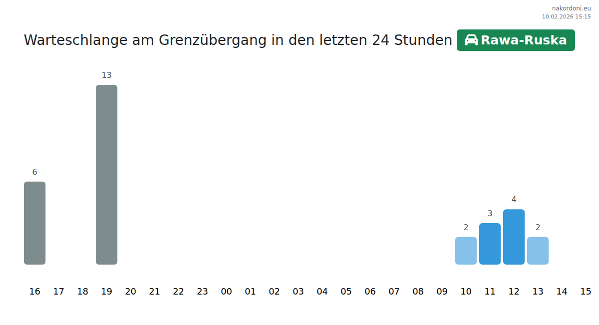 An Rawa-Ruska betragen Wartezeiten für Pkw 15-81 Minuten. Meiden Sie Stoßzeiten: 14:00, 16:00, 17:00 Uhr. Die besten Zeiten für kürzere Warteschlangen sind 09:00, 12:00, 15:00 Uhr.