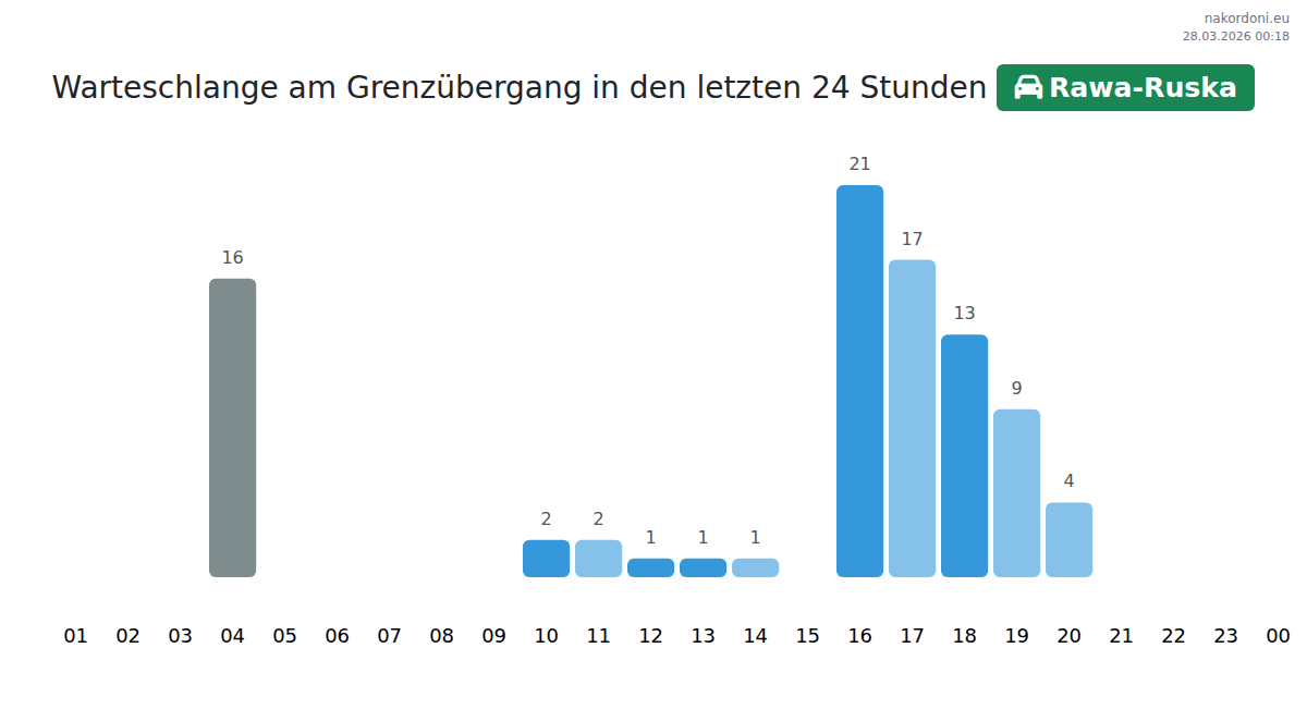 Planen Sie Ihre Reisen im Voraus und nutzen Sie aktuelle Informationen über die Warteschlangen an der Grenze am Grenzübergang Rawa-Ruska - Personenkraftwagen, um Ihren Grenzübertritt schnell und bequem zu gestalten. Achten Sie besonders auf diese Stunden, um Stoßzeiten zu vermeiden und die Wartezeiten zu verkürzen.