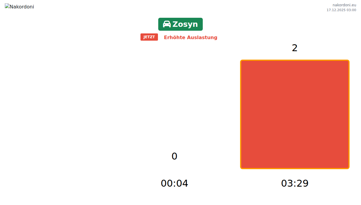 Die Anzahl der Fahrzeuge schwankte erheblich, mit Spitzen bis zu 28. Der niedrigste Punkt wurde um 17:00 27.12.2025 — 0 Personenkraftwagen. Der höchste Punkt wurde um 12:00 27.12.2025 — 28 Personenkraftwagen.