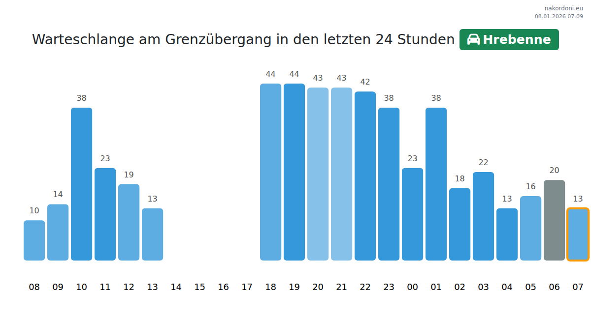 Am Grenzübergang Hrebenne liegen die Wartezeiten zwischen 15 und 267 Minuten. Vermeiden Sie Stoßzeiten um 18:00, 23:00 und 22:00 Uhr. Die besten Zeiten für kürzere Warteschlangen sind zwischen 04:00 und 06:00 Uhr.