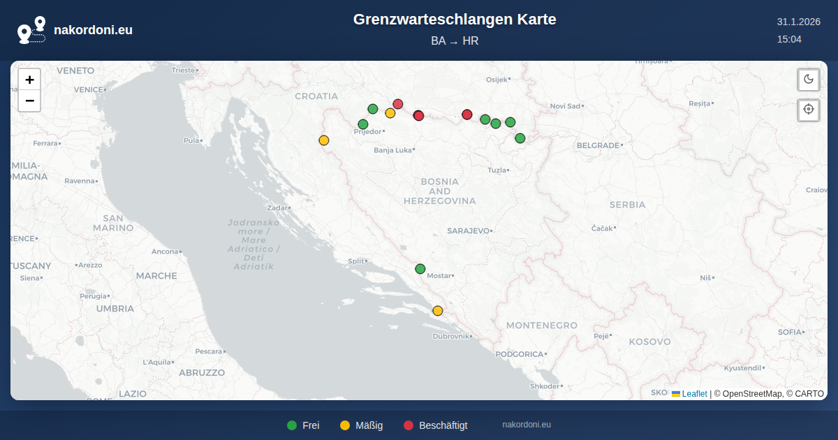 Interaktive Bosnien und Herzegowina — Kroatien Grenzkarte mit Echtzeit-Warteschlangen, Prognose und Übergangs-Status