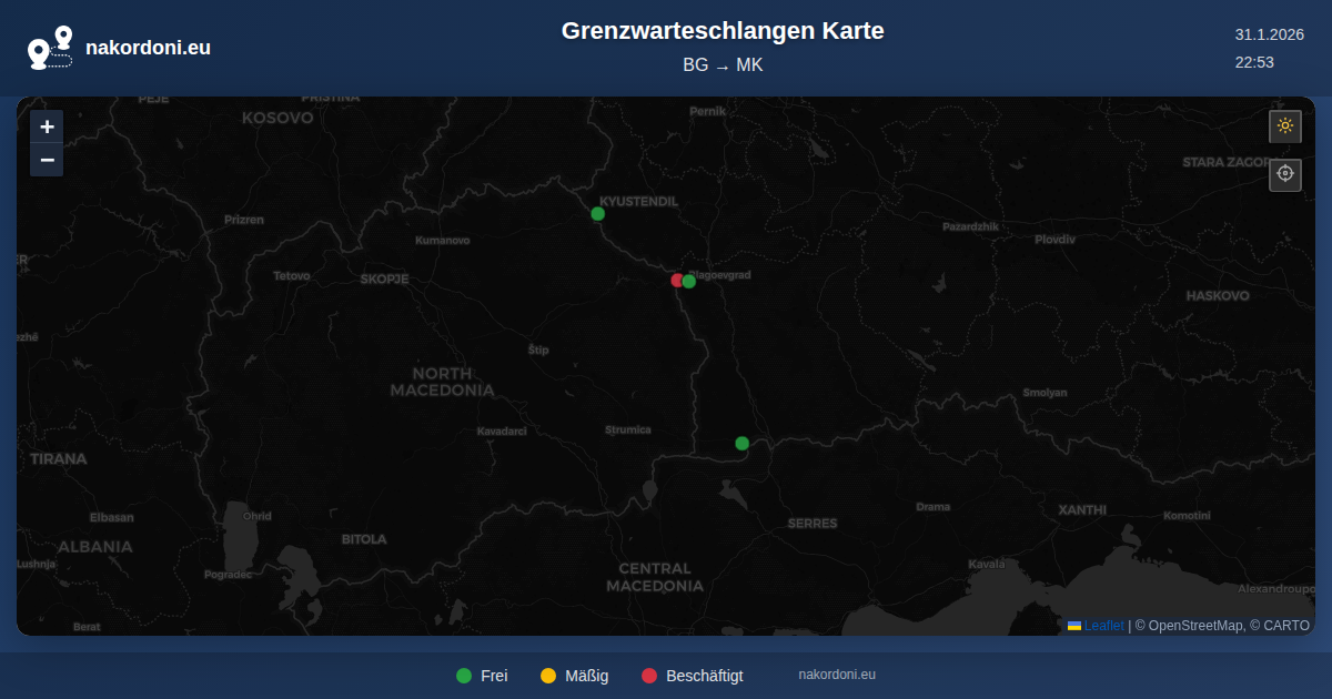 Interaktive Bulgarien — Nordmazedonien Grenzkarte mit Echtzeit-Warteschlangen, Prognose und Übergangs-Status