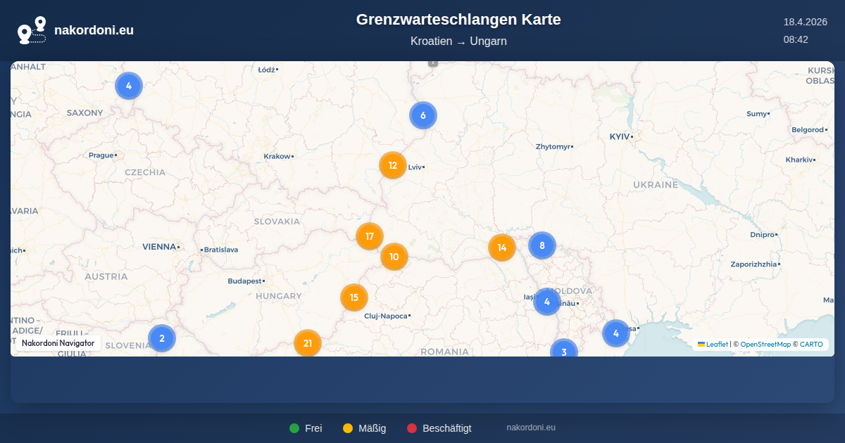 Interaktive Kroatien — Ungarn Grenzkarte mit Echtzeit-Warteschlangen, Prognose und Übergangs-Status