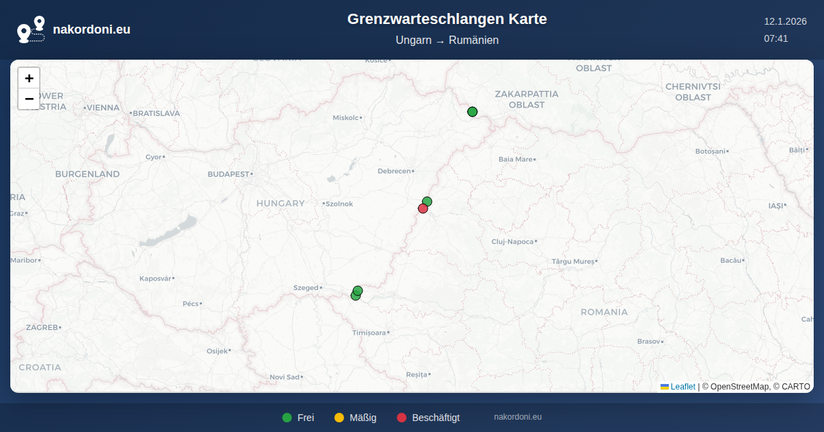 Interaktive Slowakei — Rumänien Grenzkarte mit Echtzeit-Warteschlangen, Prognose und Übergangs-Status