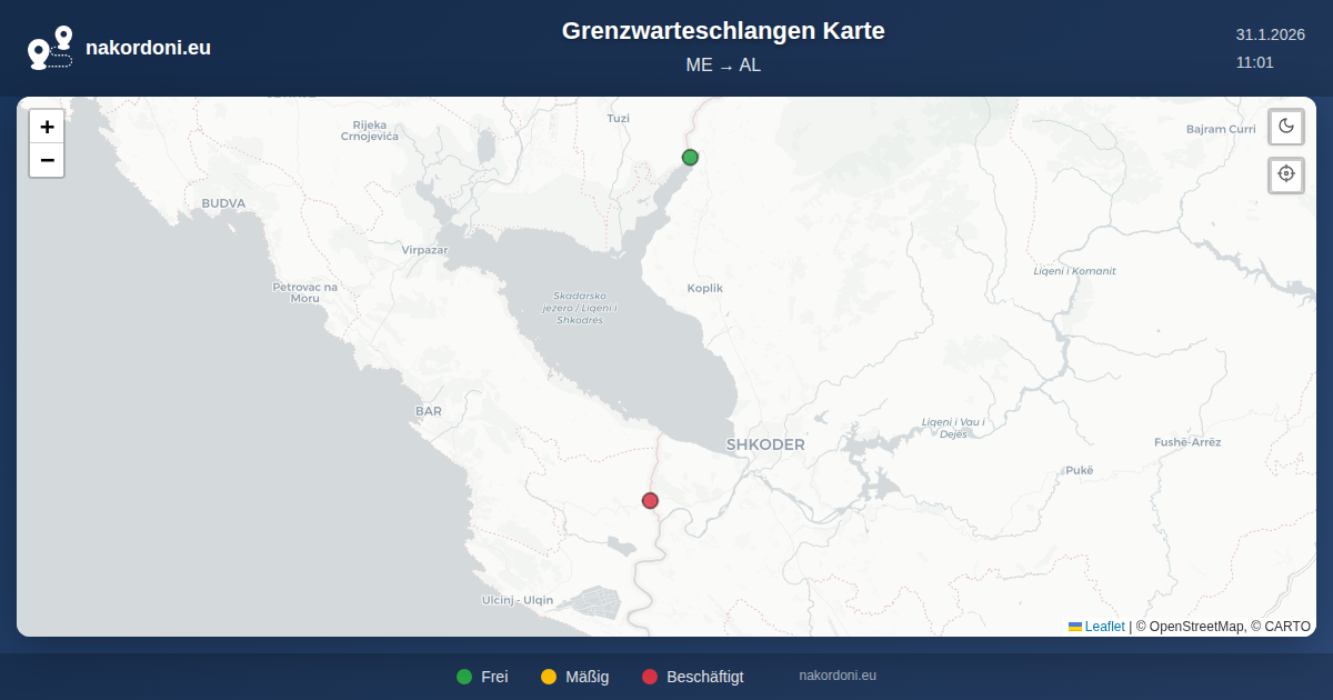 Interaktive Montenegro — Albanien Grenzkarte mit Echtzeit-Warteschlangen, Prognose und Übergangs-Status