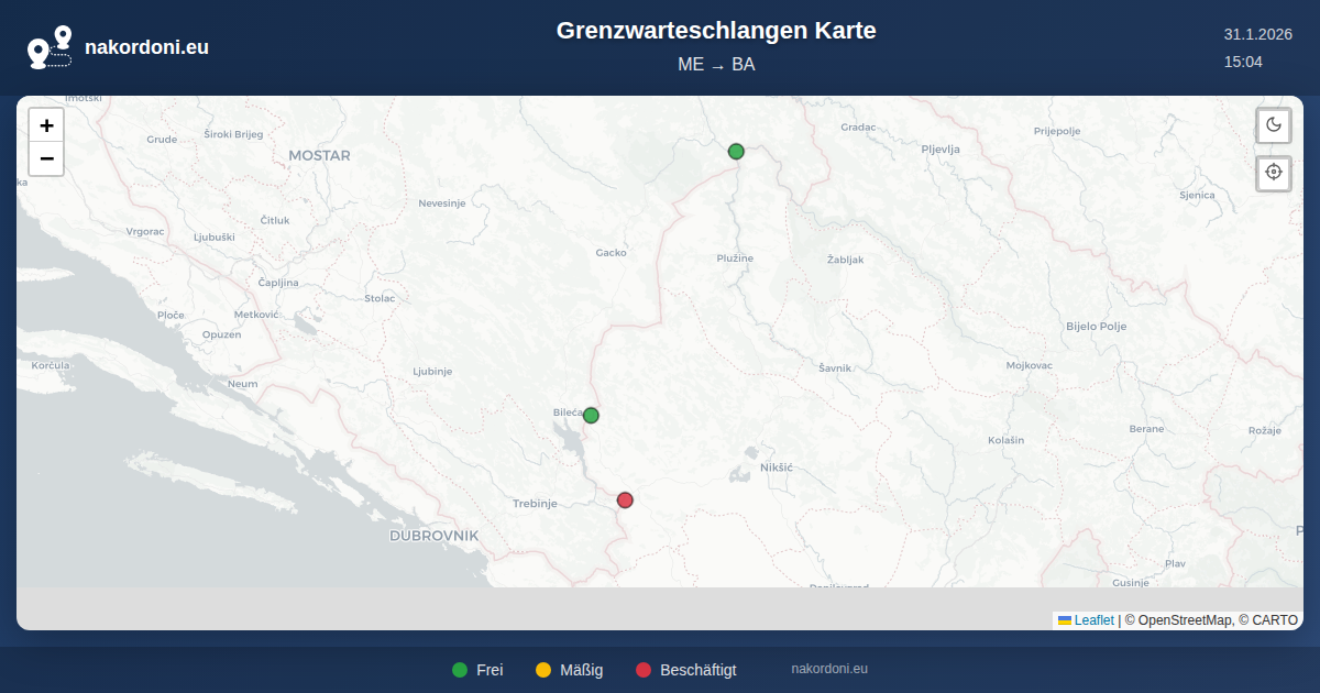 Interaktive Montenegro — Bosnien und Herzegowina Grenzkarte mit Echtzeit-Warteschlangen, Prognose und Übergangs-Status