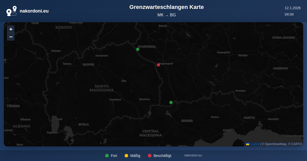 Interaktive Nordmazedonien — Bulgarien Grenzkarte mit Echtzeit-Warteschlangen, Prognose und Übergangs-Status