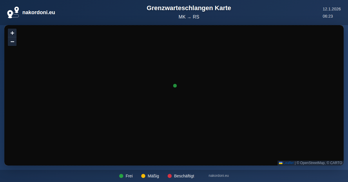 Über diese Karte. Diese interaktive Karte zeigt alle Grenzübergänge für die ausgewählte Route. Nahe gelegene Übergänge werden in klare Marker zusammengefasst; Farben zeigen die Gesamtbelastung an (grün, gelb, rot). Öffnen Sie einen Marker, um den Übergangsnamen, verfügbare Typen und genaue Werte für den aktiven Zeithorizont zu sehen. In der Tabelle verwenden Sie "Auf Karte anzeigen", um einen Übergang zu fokussieren, oder "Öffnen", um seine detaillierte Seite zu besuchen.