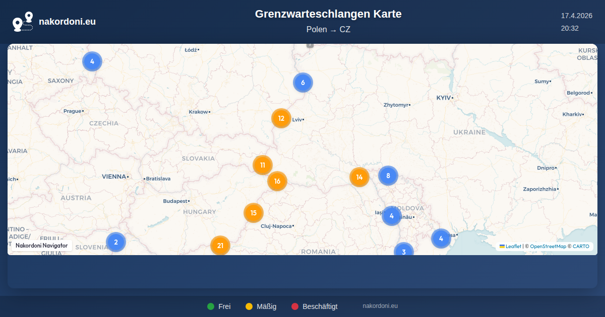 Interaktive Polen — CZ Grenzkarte mit Echtzeit-Warteschlangen, Prognose und Übergangs-Status