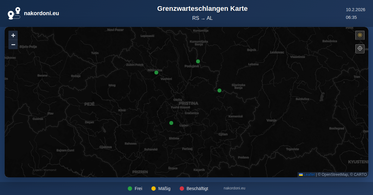 Interaktive Serbien — Albanien Grenzkarte mit Echtzeit-Warteschlangen, Prognose und Übergangs-Status