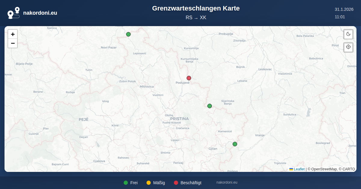 Interaktive Serbien — Kosovo Grenzkarte mit Echtzeit-Warteschlangen, Prognose und Übergangs-Status