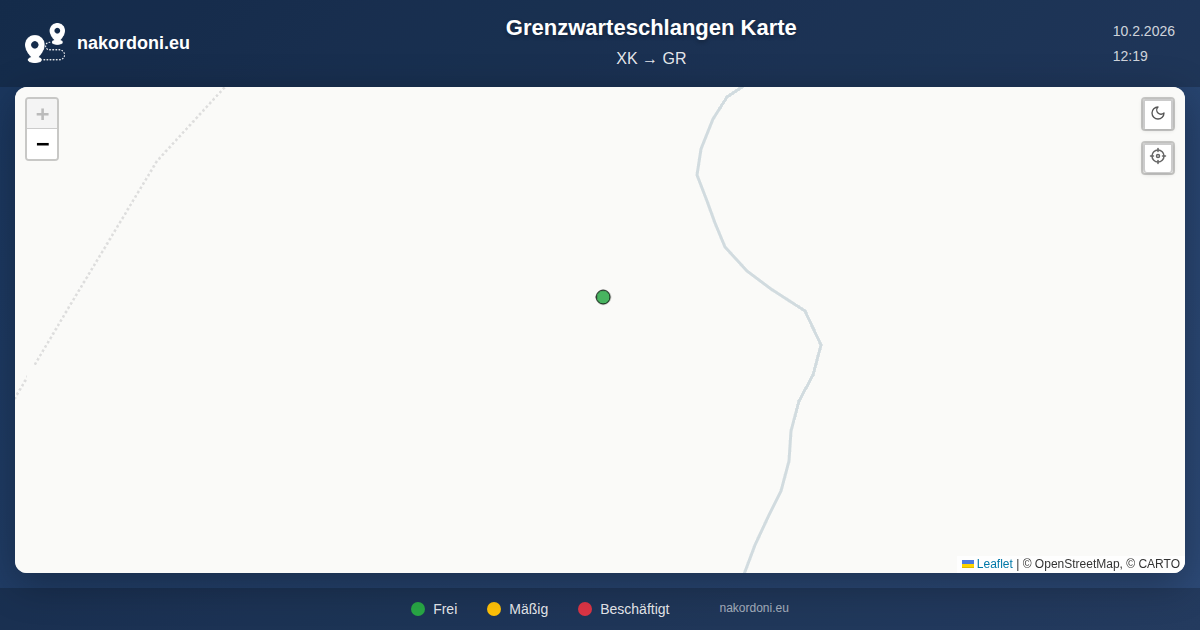 Über diese Karte. Diese interaktive Karte zeigt alle Grenzübergänge für die ausgewählte Route. Nahe gelegene Übergänge werden in klare Marker zusammengefasst; Farben zeigen die Gesamtbelastung an (grün, gelb, rot). Öffnen Sie einen Marker, um den Übergangsnamen, verfügbare Typen und genaue Werte für den aktiven Zeithorizont zu sehen. In der Tabelle verwenden Sie "Auf Karte anzeigen", um einen Übergang zu fokussieren, oder "Öffnen", um seine detaillierte Seite zu besuchen.