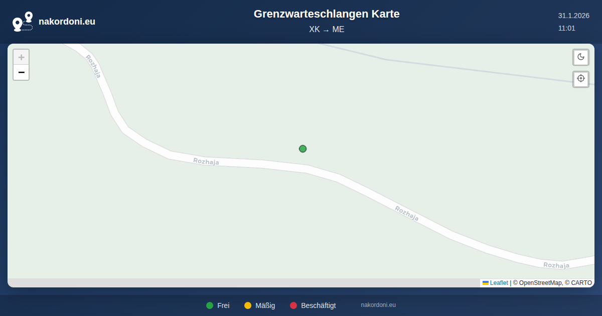 Interaktive Kosovo — Montenegro Grenzkarte mit Echtzeit-Warteschlangen, Prognose und Übergangs-Status