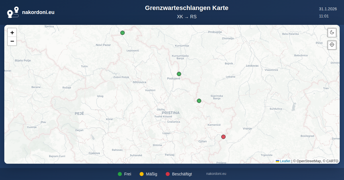 Interaktive Kosovo — Serbien Grenzkarte mit Echtzeit-Warteschlangen, Prognose und Übergangs-Status