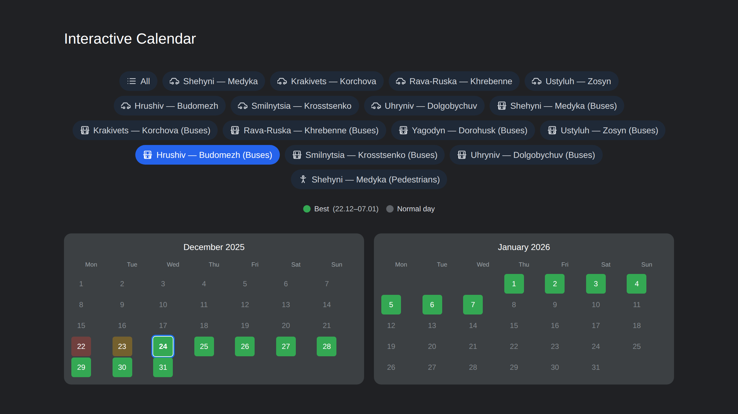 This guide's purpose is to help you choose optimal days and times for crossing to minimize wait times. On this page you'll find an interactive queue forecast calendar, real-time data from 16 checkpoints, hourly traffic analysis, and expert recommendations.