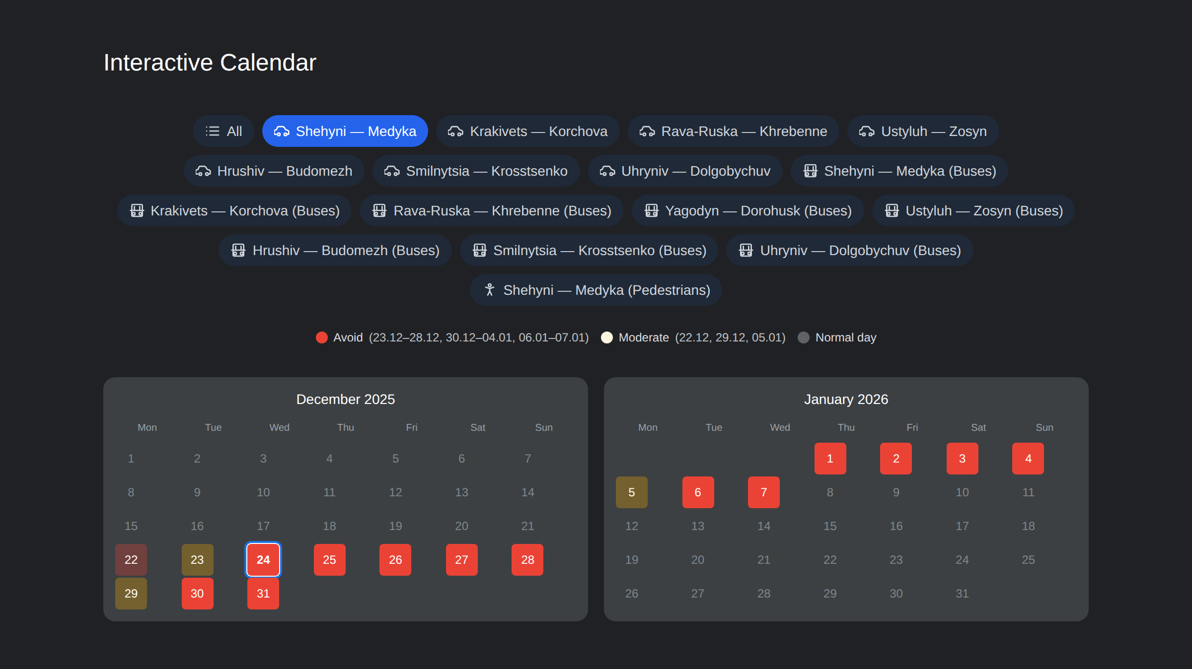 This guide's purpose is to help you choose optimal days and times for crossing to minimize wait times. On this page you'll find an interactive queue forecast calendar, real-time data from 16 checkpoints, hourly traffic analysis, and expert recommendations.