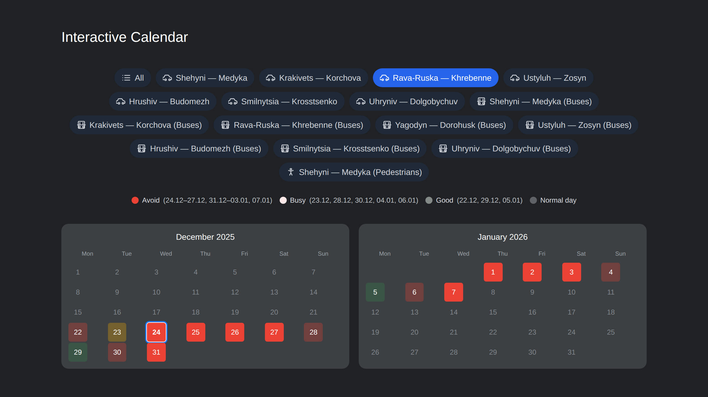 During the holiday period 22.12–07.01.2026, expect increased traffic at the border. We track queues at 16 checkpoints in real-time.