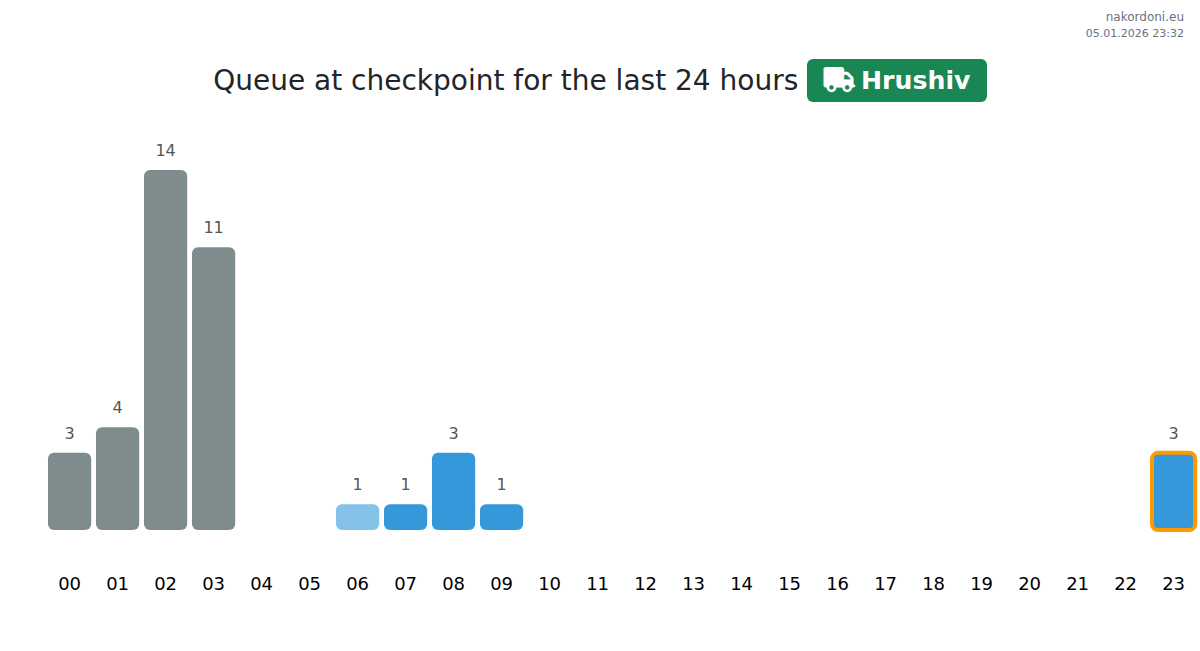 Plan your trips in advance using up-to-date border queue information at the Hrushiv - cargo transport (up to 7.5 tons) checkpoint to make your crossing fast and convenient. Pay special attention to these hours to avoid peak times and reduce waiting times.