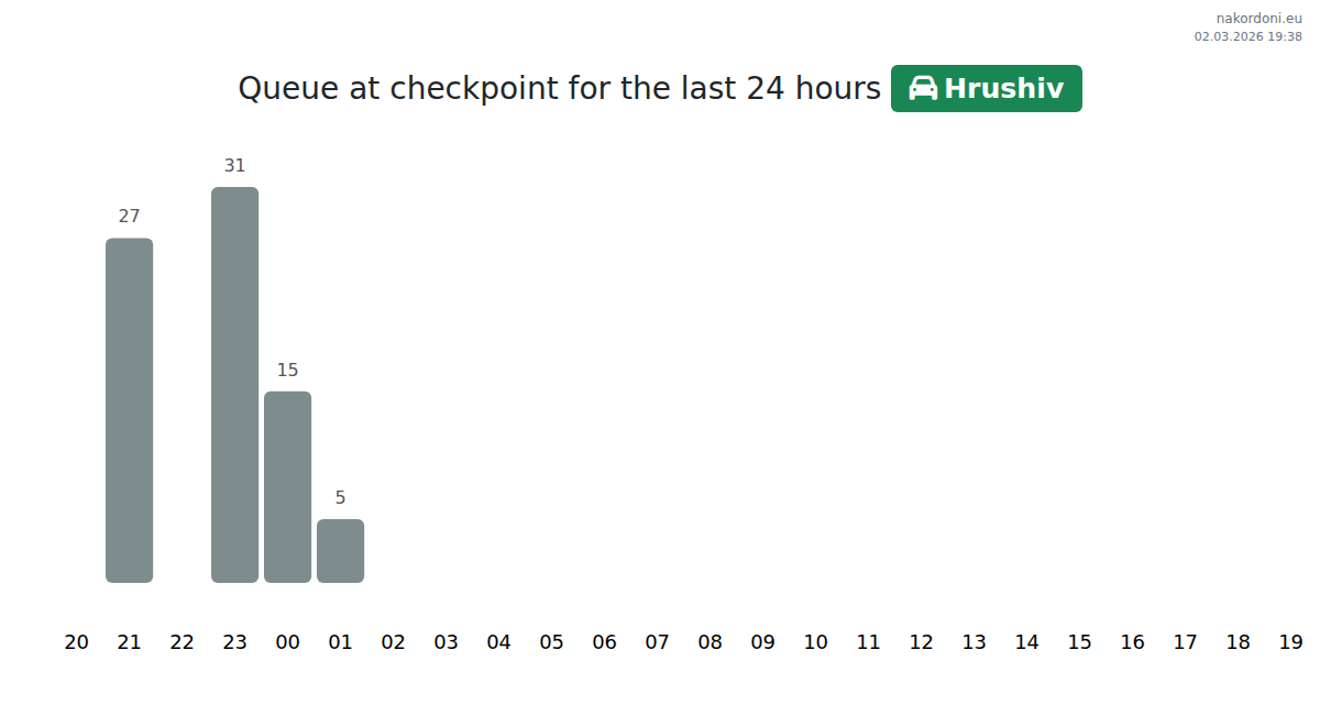 At Hrushiv, expect wait times between 15 and 3535 minutes. Avoid crossing around 05:00, 03:00, and 01:00, as these are peak hours. The shortest queues are typically observed at 15:00, 18:00, and 20:00, making these the best times to cross.
