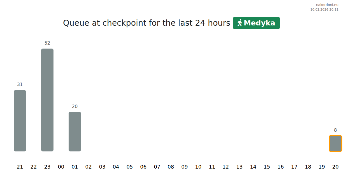 At Medyka, wait times are predicted to range from 15 to 275 minutes. Avoid peak hours at 20:00, 05:00, and 22:00. For shorter queues, consider crossing at 21:00, 23:00, or 01:00.